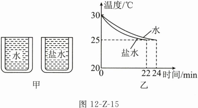 (4)如图12-Z-15甲所示,用两个同样的保温杯分别装满水和盐水,水和盐水的温度都是30℃,周围环境温度保持20℃不变,保温杯敞开口,水和盐水的温度随时间变化的关系图像如图乙所示。已知水的比热容为$4.2×10^3 J/(kg·℃),$盐水的密度为$1.1×10^3 kg/m^3,$则盐水的比热容为______J/(kg·℃)。