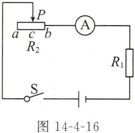 13. 如图14-4-16所示电路中,电源电压保持不变,$R_{1}= 20Ω$。闭合开关S,当移动滑动变阻器$R_{2}$的滑片P到中点c处时,电流表的示数为0.4A;当移动滑片P到最左端a点时,电流表示数为0.3A。