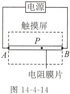 11. (2024常州模拟)如图14-4-14所示为某电阻触摸屏的内部电路结构简化图,其中AB为电阻膜片,触摸点P将电阻膜片分为AP、PB两部分,这两部分是____(选填“串联”或“并联”)的。触摸点P左右滑动时AP、PB两端电压发生变化。电源电压不变,当触摸点P水平向右滑动时,通过AP段电阻膜片的电流____,其两端的电压____(后两空均选填“变大”“不变”或“变小”)。
