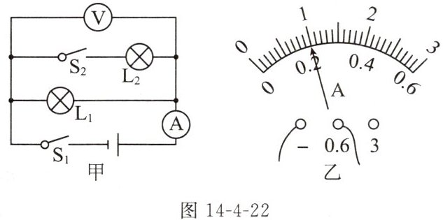 6. (2024徐州模拟)如图14-4-22甲所示电路中,电源电压和灯泡$L_{1}$、灯泡$L_{2}$的电阻均保持不变,且灯泡$L_{2}$的电阻为5Ω。只闭合开关$S_{1}$时,电流表指针偏转情况如图乙所示。随后断开开关$S_{1}$,调整电流表量程后,同时闭合开关$S_{1}和S_{2}$时,电流表指针偏转情况也如图乙所示。同时闭合开关$S_{1}和S_{2}$时,灯泡$L_{1}和L_{2}$的连接方式为____联;通过灯泡$L_{1}$的电流为____A,电压表示数为____V。