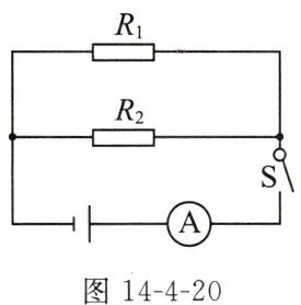 4. 如图14-4-20所示电路,电阻$R_{1}$的阻值为10Ω,闭合开关后,通过$R_{1}$的电流为0.2A,则电源电压为____V,若电流表示数为0.3A,则通过$R_{2}$的电流为____A,电阻$R_{2}$的阻值为____Ω。