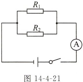 5. 在如图14-4-21所示电路中,阻值为4Ω的电阻$R_{1}$与阻值为2Ω的电阻$R_{2}$并联,闭合开关后,电流表的示数为3A,则通过电阻$R_{1}与R_{2}$的电流之比为____,电源电压为____V。