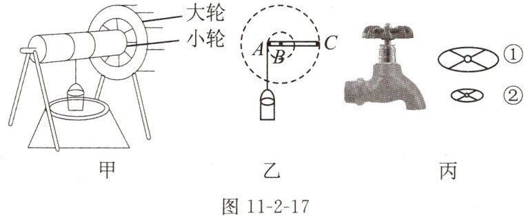 5. (2024泰州二模)如图11-2-17甲所示是《天工开物》中记载的一种在农业生产中汲水的装置,称为辘轳,图乙是它的示意图。提水时辘轳可以看作杠杆,其支点在____(选填“A”“B”或“C”)点,此时辘轳属于____(选填“省力”“费力”或“等臂”)杠杆。如图丙所示,现代家庭中有的水龙头的开关也应用了同样原理,选用转盘____(选填“①”或“②”)作为水龙头的开关效果更好。