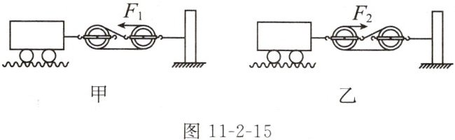 3. 如图11-2-15所示是用滑轮组把陷入泥里的车拉出来的两种方法,两种方法中较省力的是如图____所示的方法,较费距离的是如图____所示的方法。