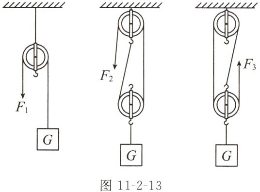 1. (2024常州金坛区一模)用如图11-2-13所示的三个装置先后提升同一个物体G,若不考虑滑轮的自重和摩擦,作用于绳子自由端的拉力$F_{1}$、$F_{2}$、$F_{3}$的大小关系是 (