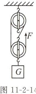 2. 如图11-2-14所示,用滑轮组匀速提升重物,若不计摩擦、绳重和滑轮重,在绳子自由端所用的拉力$F= 20N$,则物体的重力$G= $____N;若物体的重力为30N,动滑轮的重力为6N,不计摩擦和绳重,则在绳子自由端所用的拉力$F= $____N;若将绳子自由端竖直向上拉动1.5m,则重物上升____m。