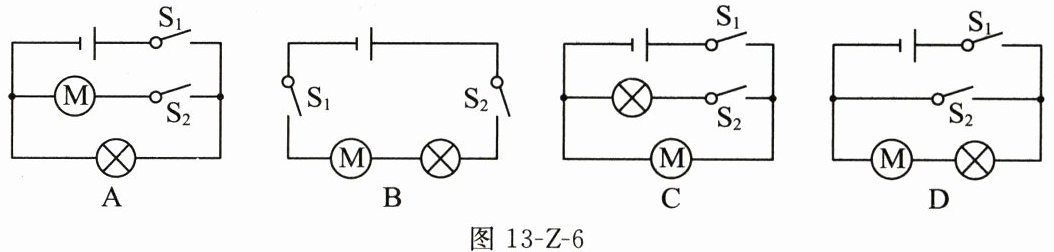 7. (2024 南京鼓楼区期中)国庆节期间,各地举行庆祝新中国成立 75 周年无人机表演活动。当开关 $ S_1 $ 闭合时无人机的指示灯亮起,再闭合 $ S_2 $ 时电动机启动,无人机起飞。如图 13-Z-6 所示的电路设计符合要求的是 ()