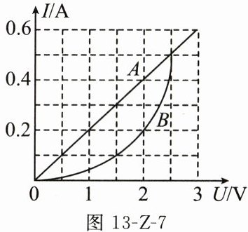 8. 有两个电路元件 $ A $ 和 $ B $,流过元件的电流与其两端电压的关系如图 13-Z-7 所示。若它们串联在某一电路中时,$ A $ 中电流为 $ 0.1 \, \text{A} $,则它们并联在同一电路中时,干路中的电流为 ()