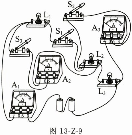 ②只闭合 $ S_1 $、$ S_2 $ 时,$ L_3 $ 短路,电流表 $ A_3 $ 测 $ L_1 $ 和 $ L_2 $ 的电流之和