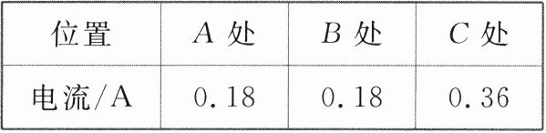 (3)纠正(2)中错误后,分别测出 $ A $、$ B $、$ C $ 三处的电流值,如下表所示。由此得出结论:并联电路中,干路电流等于各支路电流之和,且各支路的电流相等。这个实验在设计方案上还存在的不足之处是:______(写出一条)。