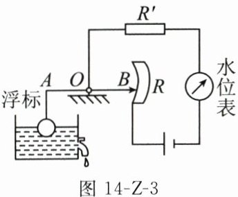 4. 小明家的屋顶上有一个水池,如图14-Z-3所示是他设计的一种自动测量水池内水位高低的装置,$R'$是定值电阻,R是滑动变阻器,它的滑片是杠杆的一端,则 ()