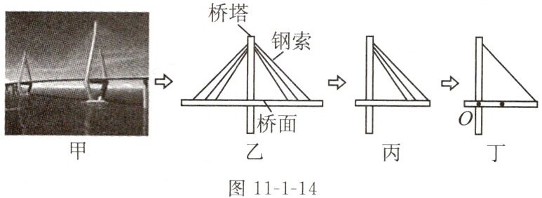14. [模型建构](2022南京模拟)如图11-1-14甲所示是某斜拉桥的实景图,该桥可逐步抽象成图乙、丙、丁所示的杠杆模型。请你在图丁中画出动力$F_{1}$(钢索的拉力)、阻力$F_{2}$(桥面的重力,作用点已画出)及动力臂$l_{1}$。