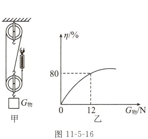 5. (2024淮安校级一模)现用如图11-5-16甲所示的装置来探究滑轮组的机械效率$η与所挂物重G_{物}$的关系,改变物重,竖直向上匀速拉动弹簧测力计,计算并绘出$η与G_{物}$的关系,如图乙所示;若不计绳重和摩擦,则动滑轮自重为______N;图乙中曲线表明,同一滑轮组的机械效率$η$随所挂物重的增大而增大,最终______(选填“会”或“不会”)达到100%;若仅改变图甲中的绕绳方式、重复上述实验,所得到的$η-G_{物}$图线与图乙所示曲线______(选填“相同”或“不同”)。