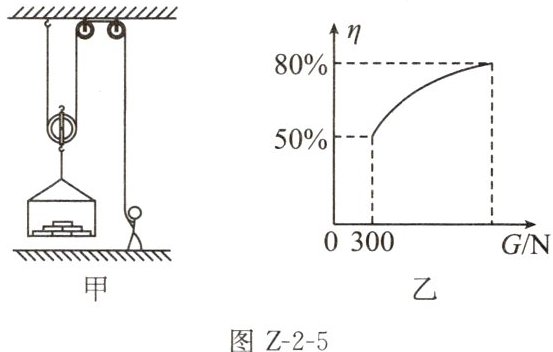 5. 建筑工人用如图 Z-2-5 甲所示的滑轮组运送建材上楼,每次运送量不定。滑轮组的机械效率随建材重力变化的图像如图乙所示。(不计绳重和摩擦,g 取 10 N/kg)