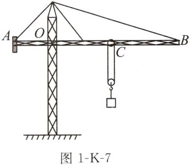 (1)现有一“塔吊”如图 1-K-7 所示,它有一水平臂 AB,AO 叫平衡臂,OB 叫吊臂。水平臂 AB 围绕 O 点转动,C 为可移动的滑轮组,C 移动的范围是从 O 点到 B 点。已知:OA= 10 m,OB= 50 m。若“塔身”的宽度和铁架、滑轮组所受重力及摩擦均不计,在 A 端所装配重的质量为 5 t,要想起吊质量为 2 t 的水泥板,为安全起吊,C 能移动到离 O 点的最远距离是______m,配重的重力是______N。