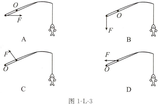 2.(2024南通)钓鱼活动深受人们喜爱。如图1-L-2所示是钓鱼的情境,你认为最合理的拉起鱼竿的方式是图1-L-3中的( D )