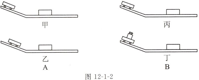 5. (1)如图12-1-2A所示,让小车分别从相同斜面的不同高度由静止开始滑下,小车刚运动到水平表面时,图______中的小车速度大;图______中的木块被撞击后移动的距离长。(均选填“甲”或“乙”) 链接例2方法指导