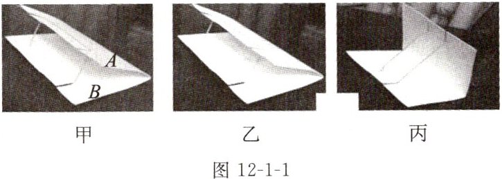 4. [教材素材题](2023泰州海陵区校级月考)如图12-1-1甲所示为“会跳的卡片”,A为卡片外侧,B为卡片内侧,实验时应把______(选填“A”或“B”)面朝下紧贴桌面,压平后迅速松开手,观察到的现象是______,这个现象说明:发生弹性形变的橡皮筋能对卡片______,因此它具有______能。图乙、丙是用相同的橡皮筋,相同的卡片制成的,且剪开豁口的深度也是相同的,但乙的豁口间距离更大,实验时分别将它们在桌面上压平之后松开手,______(选填“乙”或“丙”)卡片可以弹跳得更高一些。
