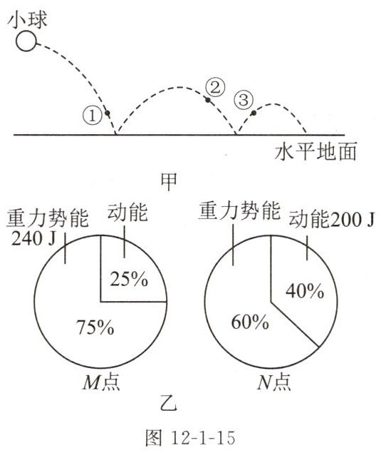 9. (2024南京秦淮区月考)某小球被水平抛出后,其部分运动轨迹如图12-1-15甲所示,其中位置①和③离地高度相等,小球在运动过程中经过M、N两点,其动能和重力势能的参数如图乙所示,且M、N两点分别为图中①②③三点中的两点,则小球 ()