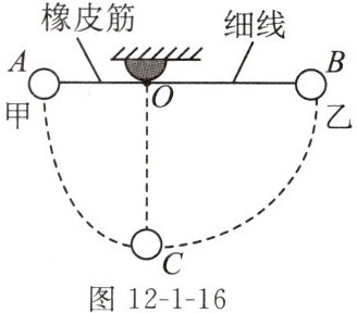 10. (2024南京一模)如图12-1-16所示,完全相同的甲、乙两球分别由橡皮筋OA和无弹性细线OB系于O点(OA<OB),先后从水平位置由静止开始释放,不计空气阻力。两球到达O点正下方C点时,橡皮筋与细线长度恰好相等。摆下过程中,乙球的______能转化为______能,两球下落到C点的过程中重力做功分别为W甲、W乙,两球在C点时的机械能分别为E甲、E乙,则它们的大小关系为W甲______W乙,E甲______E乙。(后两空均选填“>”“<”或“=”)
