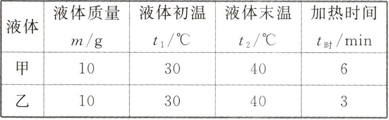 (2)下表是小明探究甲、乙两种液体的吸热能力时记录的实验数据。