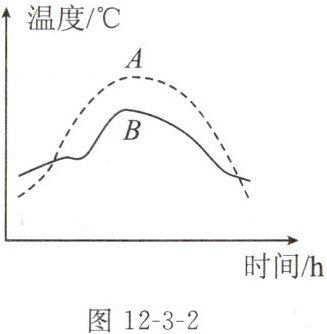 10. (2023无锡校级模拟)图12-3-2是某沿海城市和内陆城市在同一天的气温变化曲线,内陆城市气温变化对应的曲线是______(选填“A”或“B”),这是由于沙石的比热容______(选填“大于”或“小于”)水的比热容,相同质量的沙石和水吸收相同热量后沙石的温度变化较______(选填“大”或“小”)。