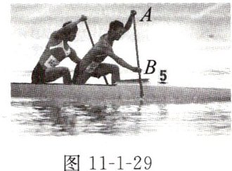6. [教材素材题](2024盐城亭湖区校级一模)船桨可看成一根杠杆,如图11-1-29所示,A为支点,要使划船时所用的力小一些,则运动员两只手之间的距离应______(选填“增大”或“减小”)一些,船桨属于______(选填“省力”“等臂”或“费力”)杠杆,使用它的优点是______。