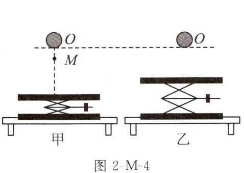 4. [科学推理](2024盐城亭湖区校级一模)如图2-M-4所示,将一只乒乓球从O点由静止释放,竖直下落撞击到升降台上,弹起的最高点为M;若只将升降台升高至图乙所示的位置,乒乓球下落弹起后到达的最高点为N,不计碰撞过程中的能量损失。则N点()