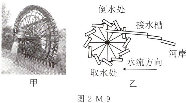 9. [传统文化](2024泰州姜堰区模拟)《天工开物》是我国古代的科学著作,书中记载着大量的古代农业机械,其中这样写道:“凡河滨有制筒车者,堰陂障流,绕于车下,激轮使转,挽水入筒,一一顷于枧内,流入亩中,昼夜不息,百亩无忧。”该段文字描述了一种机械筒车(如图2-M-9甲所示)以水流作动力,用来取水。其示意图如图乙所示,若接水槽离取水处高4m,水轮上有12个取水筒,一个取水筒每次可取水4kg,筒车旋转一周所用时间为60s。(接水槽离倒水处的高度忽略不计,g取10N/kg)