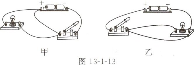 14. 如图 13-1-13 甲、乙所示的实物电路图中,各有一根导线连接错误而使闭合开关后小灯泡被短接,请把这根导线找出来,在上面打“×”。