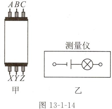 15. [科学思维](2024 镇江期末)如图 13-1-14 甲所示是高层建筑的墙体中三根绞在一起的电线,可以用如图乙所示的“测量仪”连接在 X、Y、Z 这一端把它们区分开。将 A 和 C 拧在一起时,当“测量仪”连接在 X、Y 两端,灯泡发光,则____是同一根电线。接着拆开 A 和 C,将 A 和 B 拧在一起,测量仪一端必须与____(选填“X”“Y”或“Z”)相连,另一端导线连接____次电路能将导线辨别开。