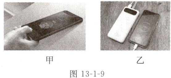 10. (2023 南通崇川区校级月考)指纹识别解锁是目前较为流行的手机解锁方式,如图 13-1-9 甲所示,手指轻轻触碰感应区,识别出正确的指纹后手机自动开锁,则感应区相当于手机电路中的____。如图乙所示,在用充电宝给手机充电的过程中,手机电池相当于____;此过程中手机将____能转化