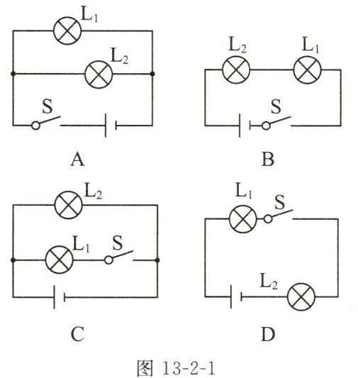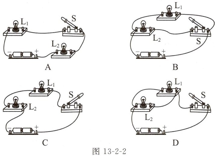 2. 如图13-2-2所示,开关能够同时控制两盏灯且两灯发光情况互不影响的电路是 (