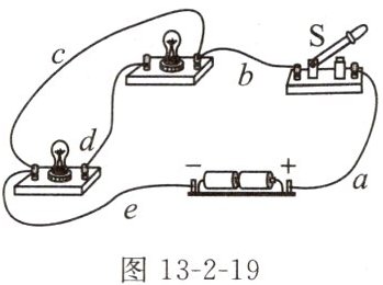 12. 如图13-2-19所示是做“组成串、并联电路”的实验时小明连接的电路,要使两灯泡串联,需要去掉的导线是____。如果要使两个灯泡并联,请改动原电路中的一根导线,使其成为正确的电路(在错误的导线上打“×”,并用笔画线代替导线将正确的补上)。