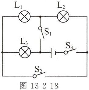 11. (2023宿迁沭阳校级月考)在如图13-2-18所示的电路中,若要使灯$L_1、$$L_2、$$L_3$串联,则应仅闭合开关____;若只要灯$L_2$发光,则应仅断开开关____;若三个开关均闭合,则发光的灯有____,它们是____联的。链接例4方法指导