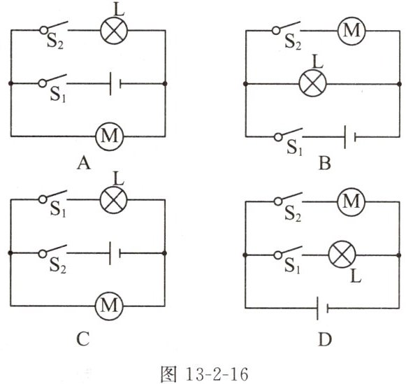 9. (2023徐州模拟)某种电脑键盘清洁器有两个开关,开关$S_1$只控制照明用的小灯泡L,开关$S_2$只控制吸尘用的电动机M。在如图13-2-16所示的四个电路图中,符合上述要求的是链接例3方法指导(