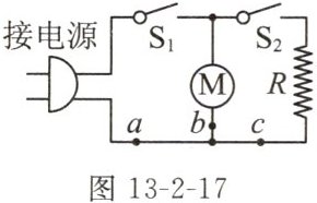 10. (2024常州溧阳期中)如图13-2-17所示是某取暖器简化工作电路图,图中元件M是装有扇叶能吹风的电动机,元件R通电时会产生热。若只闭合开关$S_1,$取暖器____(选填“只吹风”“吹热风”或“不吹风”)。为了安全起见,取暖器一般都要安装一个跌倒开关S,当跌倒时整个电路断开,则跌倒开关S应安装在图中的____(选填“a”“b”或“c”)处。