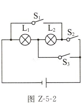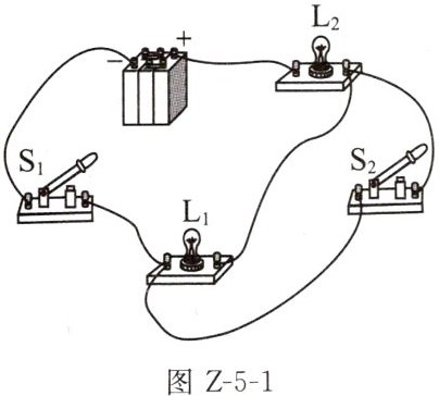 1. 小谢在做实验时,先连成如图 Z-5-1 所示的电路,闭合开关$S_{1}$并观察灯泡亮暗情况后,再闭合开关$S_{2}$,小谢看到的现象是 ()