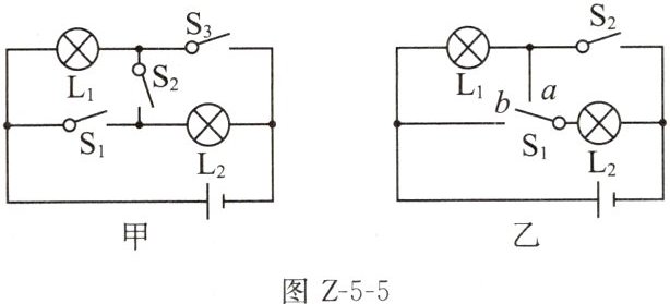 5. 为实现接在同一电路中的两灯既可串联又可并联,小明和小芳分别设计了如图 Z-5-5 甲、乙所示的电路。图甲中,闭合开关____时,两灯并联;图乙中,当开关$S_{1}$打到____(选填“a”或“b”)且$S_{2}$____时,两灯串联。对比甲、乙两图的结构可知,____(选填“小明”或“小芳”)的电路设计不会造成短路。