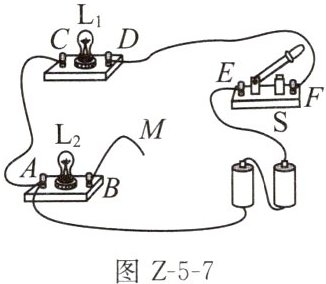 7. (2023 盐城大丰区期中)如图 Z-5-7 所示,要使$L_{1}和L_{2}$两只灯并联、开关 S 同时控制两灯,则线头 M 应接在____(填字母)点上,要使$L_{1}和L_{2}$并联,开关 S 只控制$L_{1}$,则线头 M 应接在____(填字母)点上,如果将线头 M 接 C 点,闭合开关,不发光的灯是____。