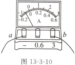 12. [科学思维](2023 扬州高邮期中)如图 13-3-10 所示是实验室常用的一种电流表,“0”刻度不在表盘的最左端。当导线 a、b 分别与标有“一”和“3”的接线柱相连时,电流表指针偏转情况如图所示,此时电流是从导线____(选填“a”或“b”)流入电流表的。为了增大指针的偏转角度从而减小读数误差,应将导线 a 与标有“____”的接线柱相连,b 与标有“____”的接线柱相连。