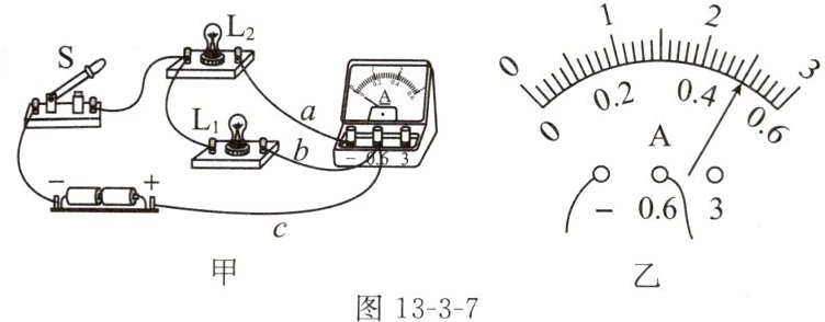 9. 如图 13-3-7 甲所示是用电流表测量电流的实物连接图,请回答下列问题: