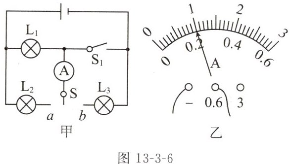 8. (2024 盐城大丰区期中)如图 13-3-6 甲所示,当 S 接 a,$S_{1}$闭合时,电流表的示数如图乙所示,电路中____(选填“$L_{1}$”“$L_{2}$”或“$L_{1}和L_{2}$都”)亮,电流表测灯____中的电流,大小是____A。当 S 接 b,$S_{1}$断开时,电流表____(选填“能”或“不能”)测出电路中电流。