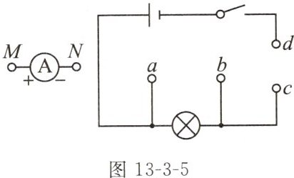 6. 如图 13-3-5 所示,M、N 表示一个电流表的两个接线柱,a、b、c、d 表示电路中的四个连接点,如果想用此电流表测量通过小灯泡的电流,那么电流表应连接在____(选填“ab”或“cd”)之间,M 接____点,N 接____点。