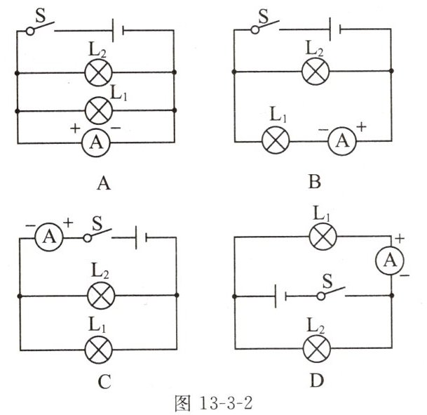 2. (2023 无锡惠山区模拟)如图 13-3-2 所示的四个电路图中,电流表能测量并联电路中通过灯$L_{1}$电流的是 ()