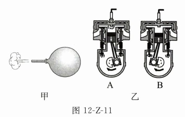 14. (2024常州金坛区校级月考)图12-Z-11甲中气球在放气时,它喷气的嘴部温度和原来相比______(选填“变高”“变低”或“没有变化”),此过程发生的能量转化与图乙中的内燃机在图______(选填“A”或“B”)所示过程的能量转化是一致的。若某四冲程汽油机每秒完成60个冲程,则每秒它对外做功______次,飞轮转过______圈。