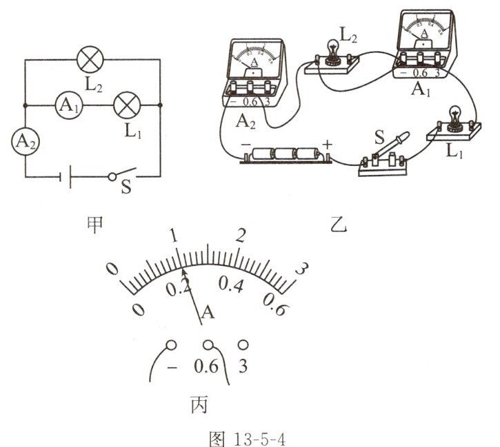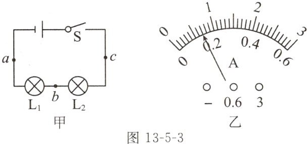 4. 在“探究串联电路的电流特点”的实验中,张虹同学选用两个规格不同的小灯泡设计了如图13-5-3甲所示的串联电路,用一个电流表分别接在a、b、c三处去测量电流。