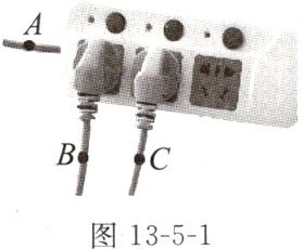 2. (2024连云港一模)如图13-5-1所示为家用插线板示意图,图中A线接入家庭电路中,B线接台灯,C线接取暖器,两个用电器均正常工作时,A、B、C三处的电流分别为$I_{A}$、$I_{B}$、$I_{C}$,则它们的大小关系正确的是 ()