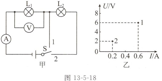9. 如图13-5-18甲所示电路中,当开关S由接1转到接2时,电压表示数的变化情况如图乙所示,则灯泡$L_2$两端的电压是______V,电源电压是______V,若此时灯泡$L_2$断路,则电压表的示数为______V。