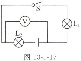 8. (2022无锡期末)如图13-5-17所示电路,电源电压为3V且保持不变。当闭合开关S时,电压表的示数为1V,则灯$L_2$两端的电压为______V;若断开开关S,则灯$L_2$将______(选填“不能发光”或“仍能发光”),电压表的示数将______(选填“变大”“变小”或“不变”)。